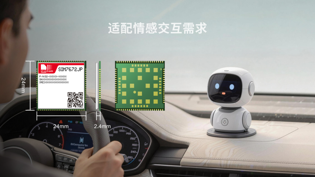 此外,SIM7672JP采用LCC+LGA紧凑封装,体积小巧,搭配UART、USB等丰富接口,可轻松嵌入小型机器人机身,集成便捷,同时集成多系统GNSS定位功能,能精准感知车辆位置与行驶状态,为场景化交互给予支撑。